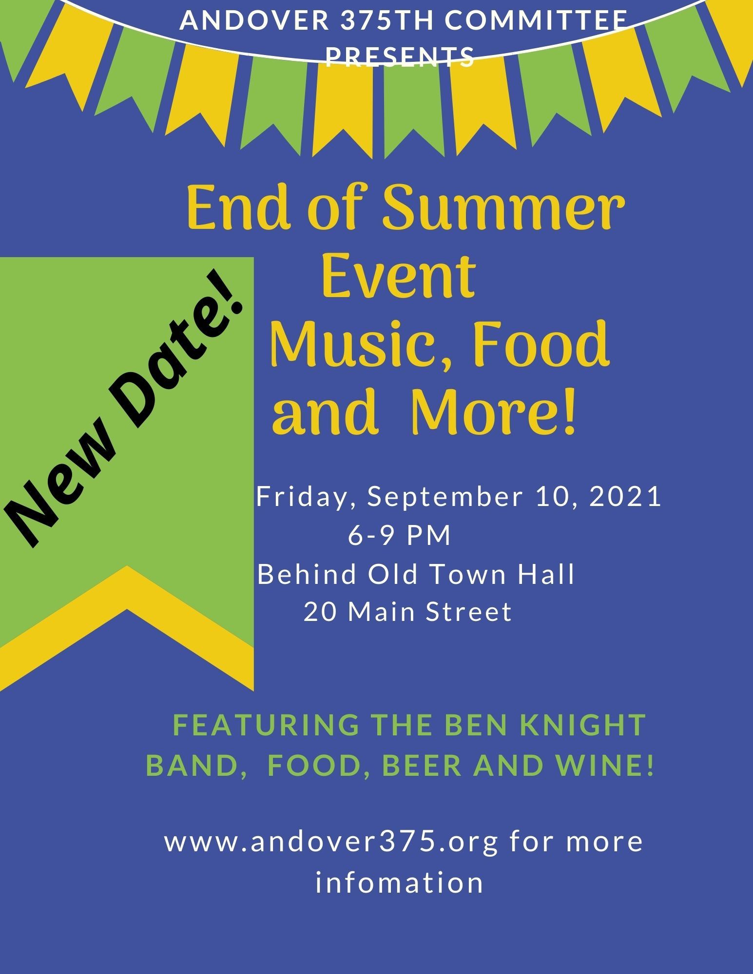 End of Summer Event – NEW DATE! Join us for beer, wine, music, food and street performers! Behind Old Town Hall, 20 Main Street, Andover, MA. Click here for more information.